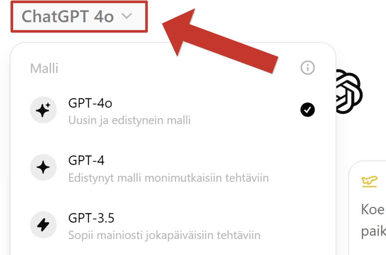 Jos haluat valita oletusmallin tuleviin keskusteluihisi, niin se onnistuu klikkaamalla ChatGPT:n ylävasemmalta mallin nimeä, ja valitsemalla haluamasi mallin listasta.