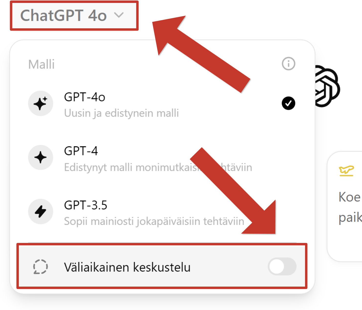 Voit aloittaa väliaikaisen keskustelun klikkaamalla ChatGPT:n nimestä (ylävasemmalla) ja klikkaamalla väliaikaisen keskustelun valitsinta.