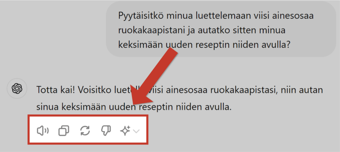 Tämä onnistuu ChatGPT:n tietokoneversiossa kun viet hiiren vastauksen alla olevan palkin ✨-napin päälle.