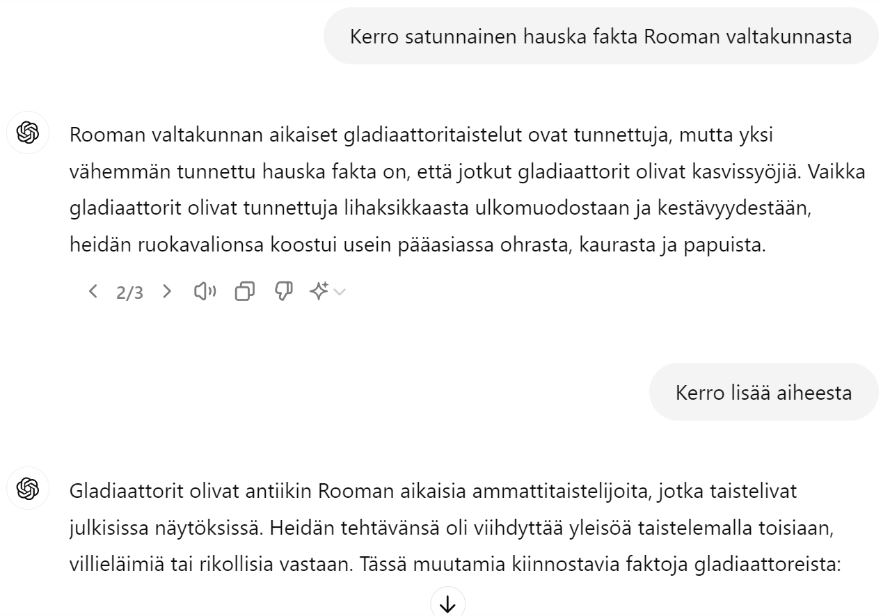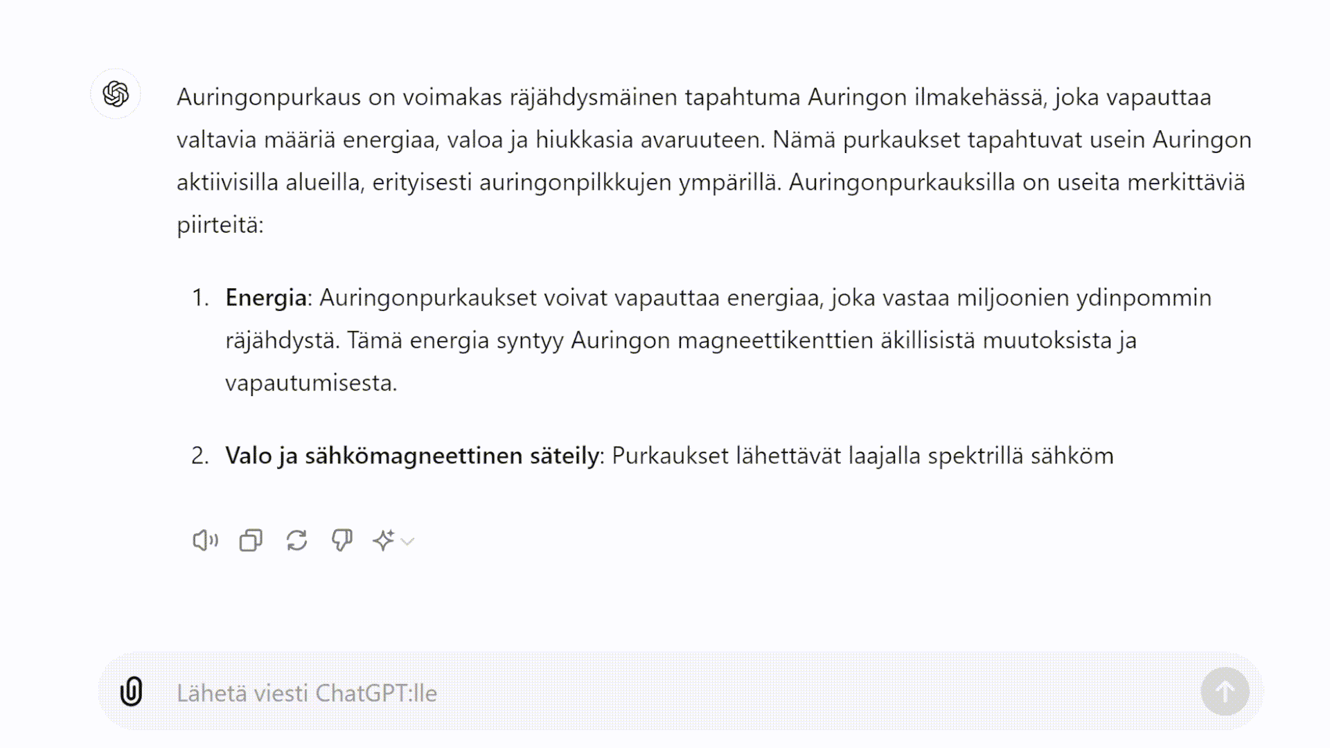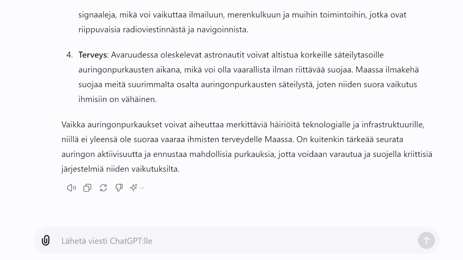 Jos esimerkiksi kysyin ensin, että “Selitä mikä on auringonpurkaus”, ja sen jälkeen kysyn “Ovatko ne vaarallisia?” niin ChatGPT tietää, että puhumme edelleen aurinkotuulista.