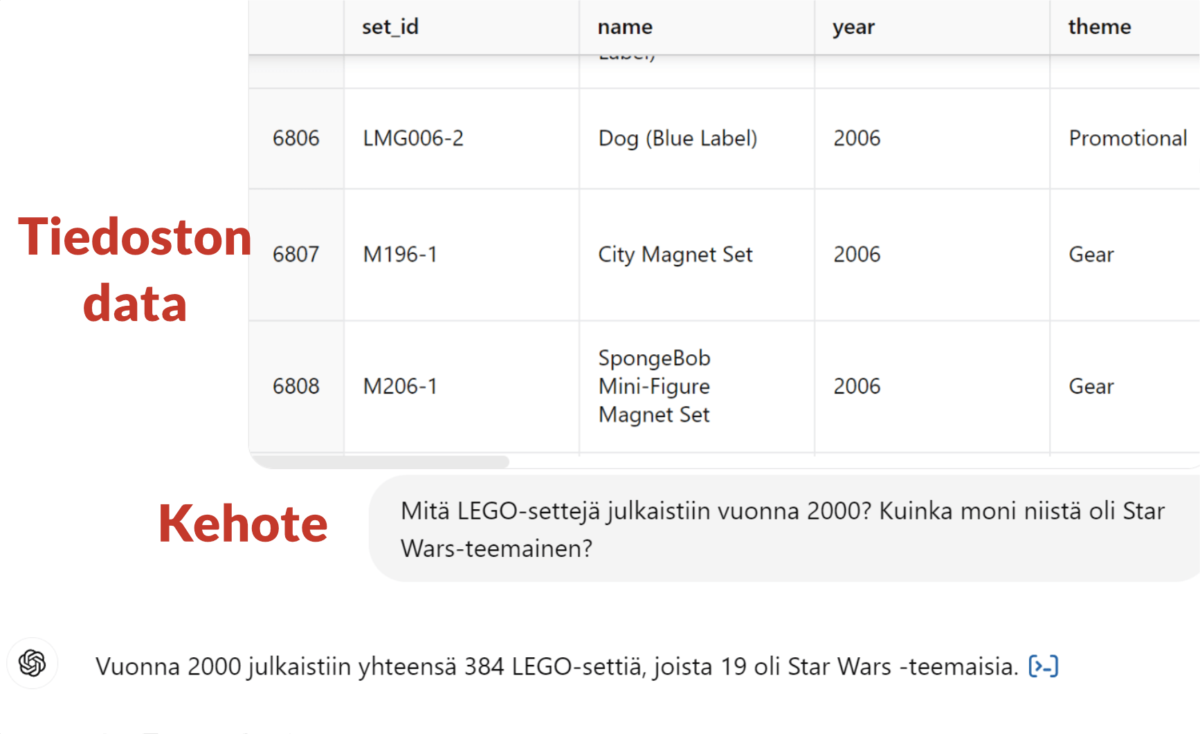 Tässä esimerkkinä tulos kysymyksistä mitä tein liittyen dataan missä oli kaikki julkaistut LEGO-setit: