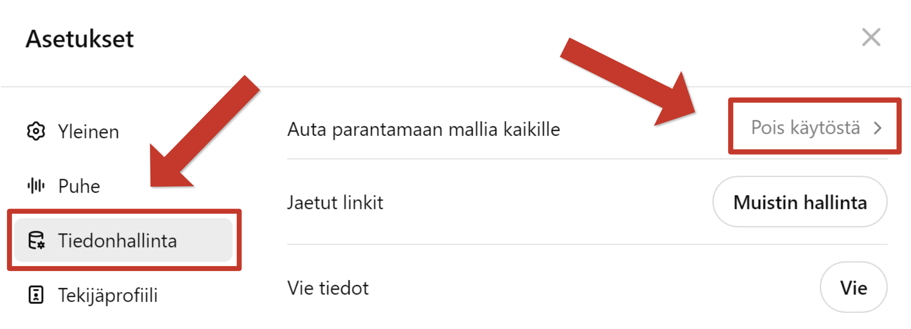 Huomaa, että ChatGPT ei uuden keskustelun aikana huomioi asioita mistä olet puhunut sille muiden keskustelujen aikana.