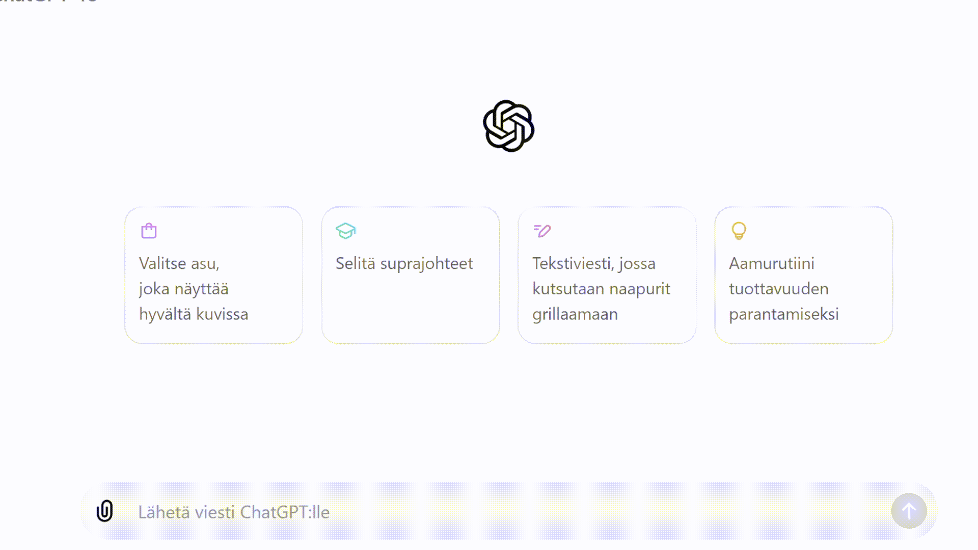 Kun käytät GPT-4o mallia, niin normaalin chattinäkymän alta voi löytää tiedosto-painikkeen.
