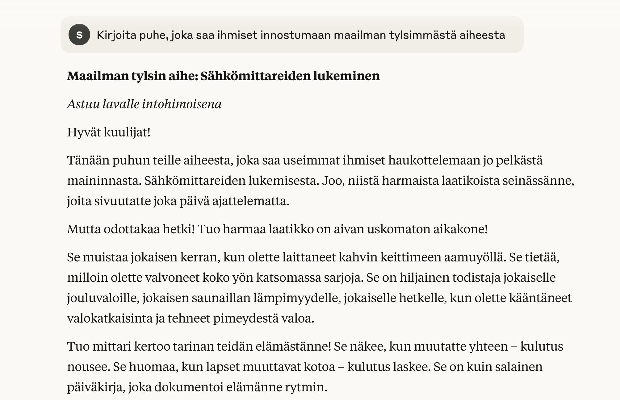 Kyseessä on Claude, jota kannattaa vähintäänkin testata, jotta saat ymmärryksen siitä, miten erilaisia tekoälychatit ovat keskenään.