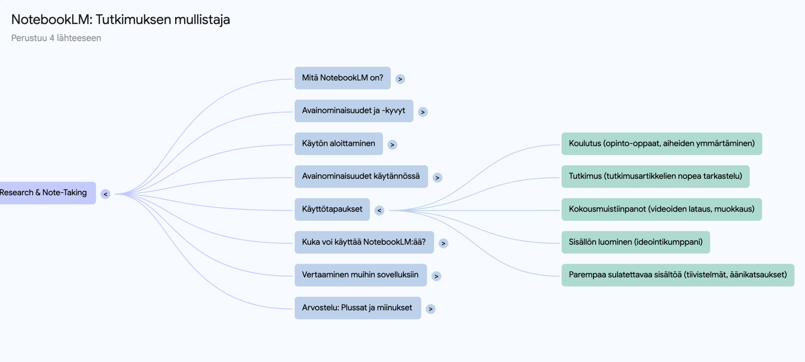 - Voit visualisoida tietoa mindmapeillä, jotka NotebookLM generoi materiaalien perusteella