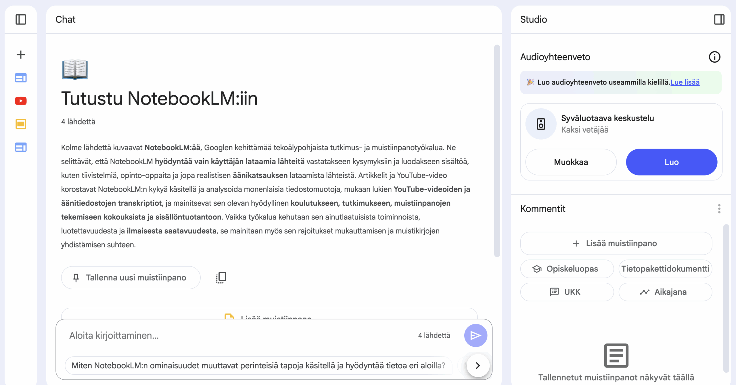Tekoäly käy sitten ne läpi ja antaa eteesi työtilan, missä voit chattimaisesti kysyä asioita, generoida erityyppisiä yhteenvetoja ja hallita lähdemateriaaleja.