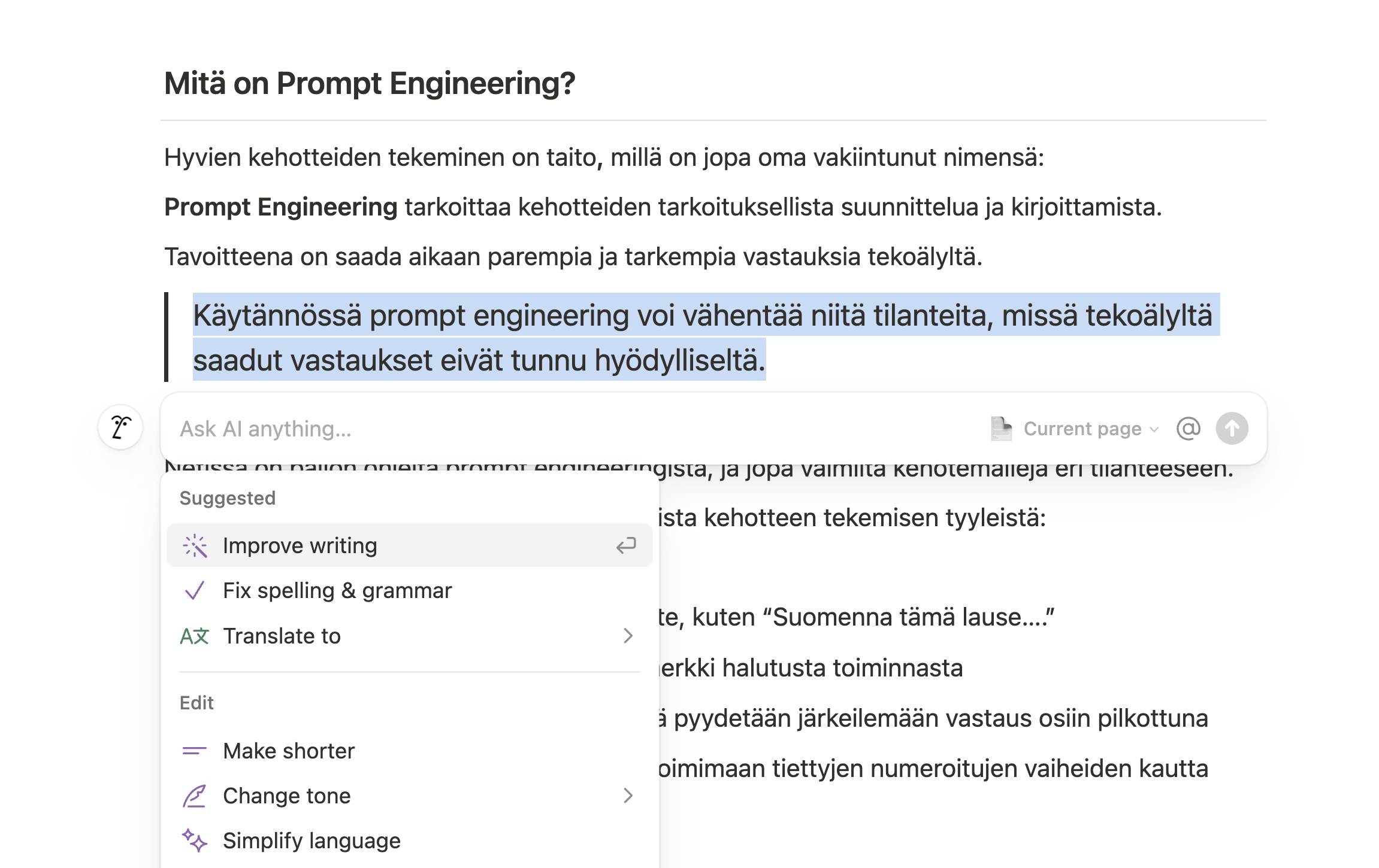 - Kirjoitusapu ja käännökset: Voit kirjoittaa ja koota erilaiset tekstit Notionin sivuille, ja saat samalla tekoälyltä apua mm. muokkaamiseen, pituuden muuntamiseen ja kielenkääntöön