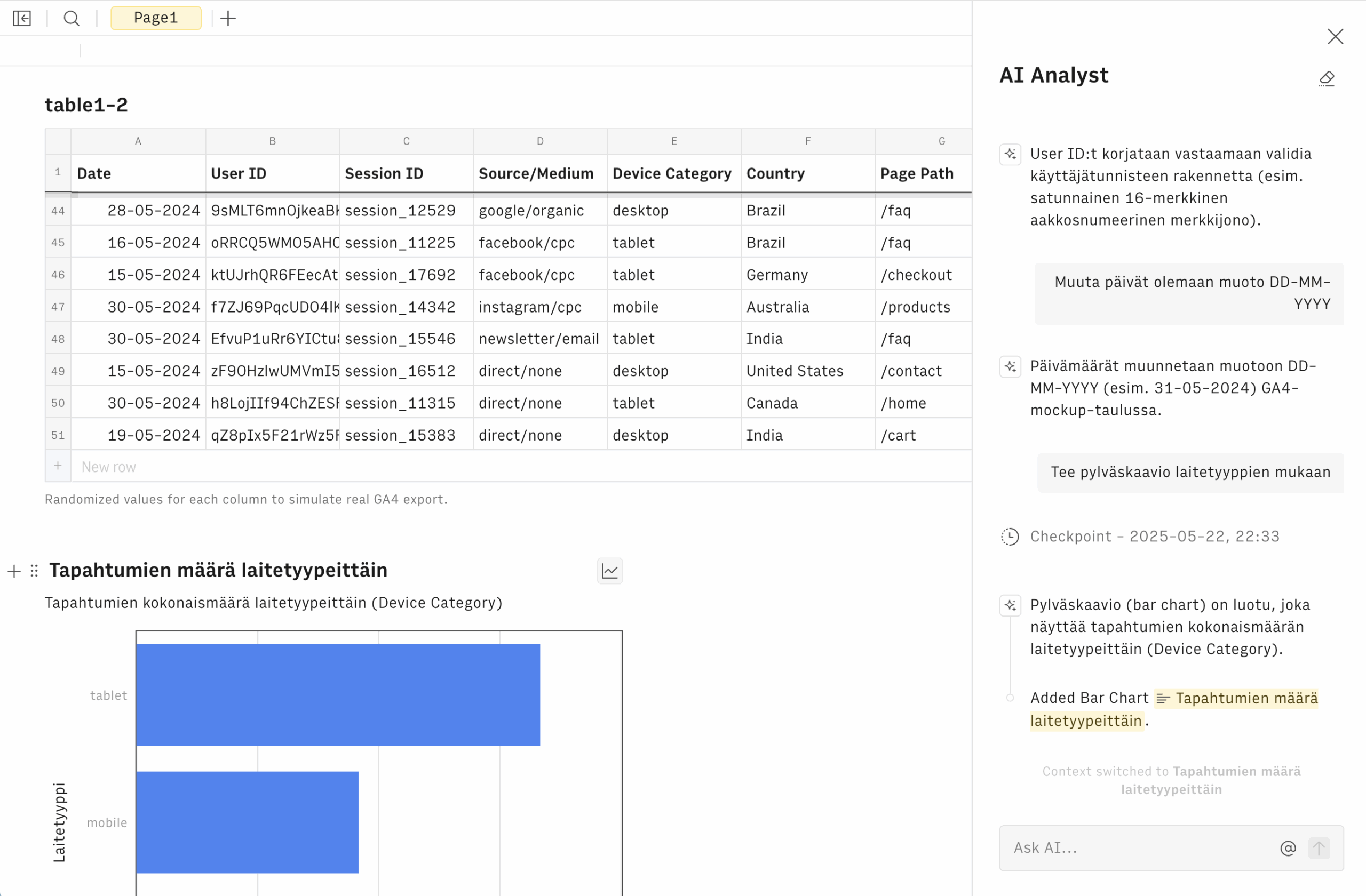 - Muokkaa dataa ilman funktioita: Kerro kehotteilla mitä muokkauksia haluat tehdä taulukoihin ja graafeihin, esimerkiksi “Tee pylväsdiagrammi myyntiluvuista”, niin Rows hoitaa asian